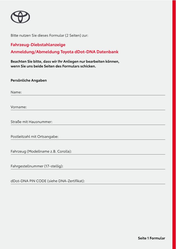 Autodiebe werden immer versierter darin, Fahrzeuge oder begehrte Einzelkomponenten zu entwenden. Deshalb bietet Toyota als erste Automarke in Deutschland eine Abwehrmethode, die Langfinger schon im Vorfeld abschreckt, überhaupt Hand an dein Fahrzeug zu legen. Setze auf eine völlig neue Prävention gegen Autodiebstahl: die Toyota dDot-DNA-Markierung.